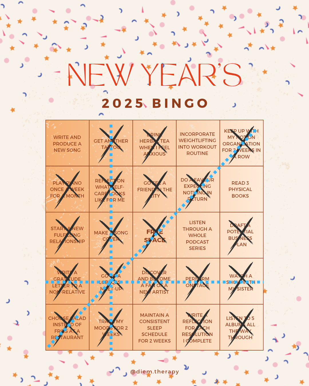 On my bingo card, you can also find more intimidating items I included for fun, such as “listen through a whole podcast series” or “start a new fulfilling relationship.” These items were not about completion but rather important reminders to reflect on certain areas of my life throughout the year — knowledge-building and social life, respectively.